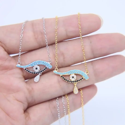 925 Sterling Silver Turkish Evil Eye Drop Necklace with CZ